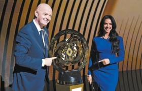 去年12月,国际足联主席因凡蒂诺在世俱杯抽签仪式上与世俱杯冠军奖杯合影。新华社发本报记者赵晓松4年一...