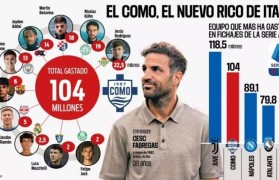 直播吧8月6日讯据西媒《阿斯报》发文表示,法布雷加斯执教的科莫今夏已经花费1.04亿欧签下10名新球...