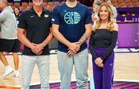 北京时间2025年8月28日,湖人总经理佩林卡和珍妮-巴斯探访了斯洛文尼亚欧锦赛训练,并与卢卡-东契...