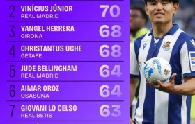 西甲被犯规数:久保建英73次居首,维尼修斯70次第二&贝林64次第5